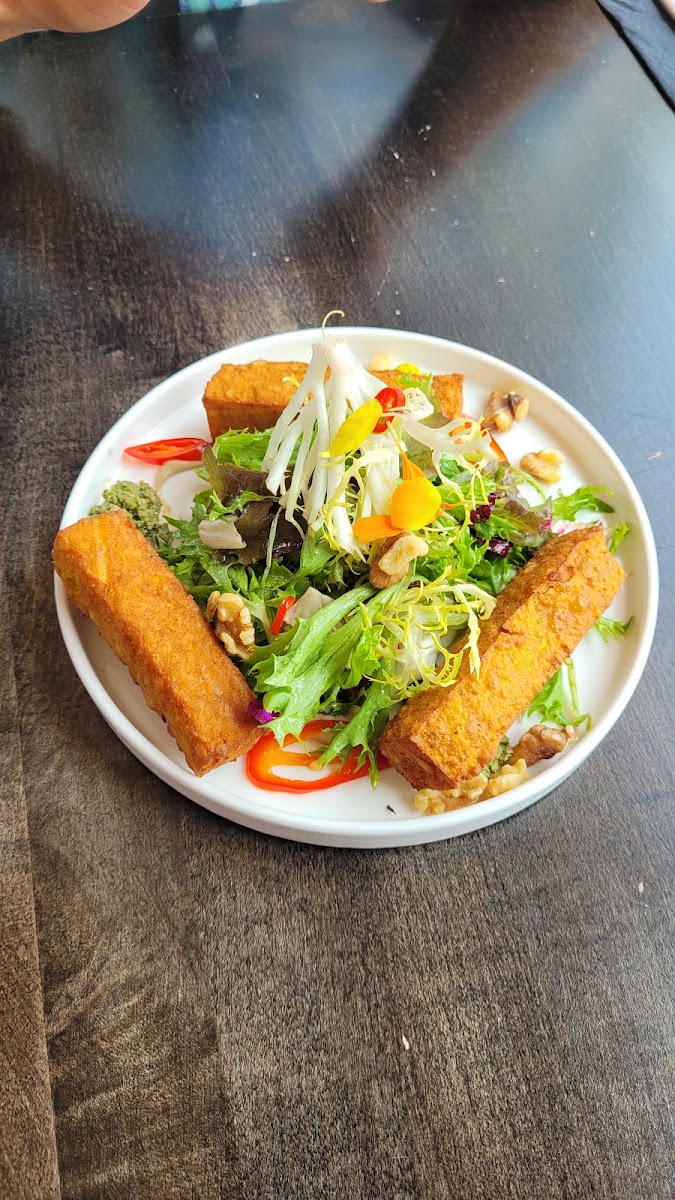 We stopped by for lunch as part of a little road trip out to Tyendinaga, and it seemed nice to be able to sit on the patio on a river, but we ended up sitting inside due to the extreme heat, which was still nice. The food was good but not great, depending on what you ordered. The fish special was salmon, which was seasoned deliciously, but why did they put ketchup all over it lol. I thought that was so weird. The pasta special (no photo) was strangely sour but also cheesy, so it made me feel a bit queasy. I got the Local salad since I wasn't hungry, but it was actually a massive portion, and I thought the toppings were unique enough to warrant ordering (apples, toasted oats, almonds) but it ended up being a really basic salad that I probably should've just made at home. However the asparagus (side dish) was delicious and I would order that again. The staff here were also very courteous regarding our nut allergies. This is a nice place to stop by for a casual lunch with family tho